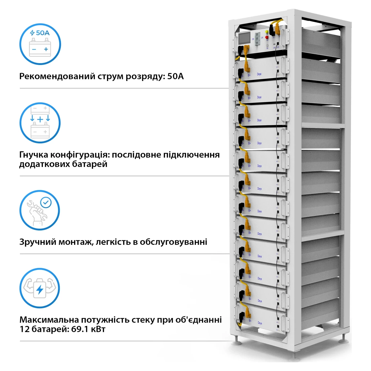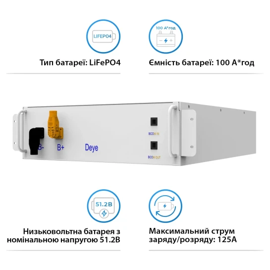 Акумуляторна батарея Deye BOS-GM5.1 LiFePO4 – це передовий енергетичний резерв, розроблений спеціально для високовольтних інверторів. Ця батарея поєднує в собі високу потужність, довгий термін служби та безпекові характеристики, що робить її ідеальним вибором для систем енергозабезпечення, які вимагають надійного та стабільного джерела енергії. Акумулятор використовує технологію літій-фосфату заліза (LiFePO4), що відома своєю високою ефективністю, довгим терміном служби та високою стійкістю до циклічного розряду та заряду. Ця технологія забезпечує стійку продуктивність протягом багатьох років.З великою ємністю 5.1 кВт*год, батарея здатна забезпечити значний обсяг електроенергії, що робить її відмінним рішенням для використання як основне джерело електроживлення або резервне джерело під час збоїв.Вбудовані захисні механізми, такі як захист від перевантаження, короткого замикання та високої температури, забезпечують безпеку використання батареї.