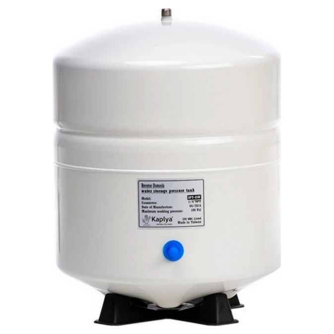 Бак Kaplya для фільтра зворотного осмосу всередині розділений на два відділи: нижня повітряна камера, яка відокремлюється від верхньої спеціальною пружною гумовою мембраною. Така конструкція дозволяє "видавлювати" чисту воду при відкритті крану тиском закачаного повітря без іншого зовнішнього впливу. Тому такий параметр як обсяг баку представляється двома показниками: загальний обсяг ємності – 15 літрів та корисний (робочий) – 11-12 літрів для накопичення чистої води.