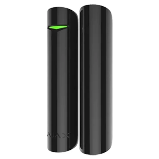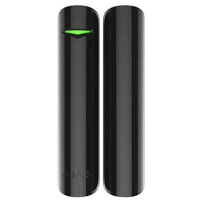 Бездротовий датчик відкриття дверей/вікна Ajax DoorProtect призначений для детектування відкриття дверей, вікон і т.д. Датчик обладнаний клемної колодкою для підключення додаткових дротяних датчиків, в тому числі дротяних датчиків відкриття призначених для установки на металеві ворота і люки. Конструктивно датчик складається з двох частин - магніту і блоку з герконом. Передбачено два варіанти магніту - для паралельної (великий магніт) і перпендикулярній (малий магніт) установки. Принцип роботи датчика відкриття заснований на властивостях геркона - елемента, здатного ставати провідником під впливом магнітного поля. У нормальному стані магніт і блок з герконом зімкнуті. Як тільки двері, на якій встановлений датчик, відкривається - магніт віддаляється від геркона, контакти розмикаються і геркон перестає проводити струм. При закритті дверей відбуваються зворотні процеси: магніт наближається до геркона, контакти замикаються і геркон починає проводити струм.
