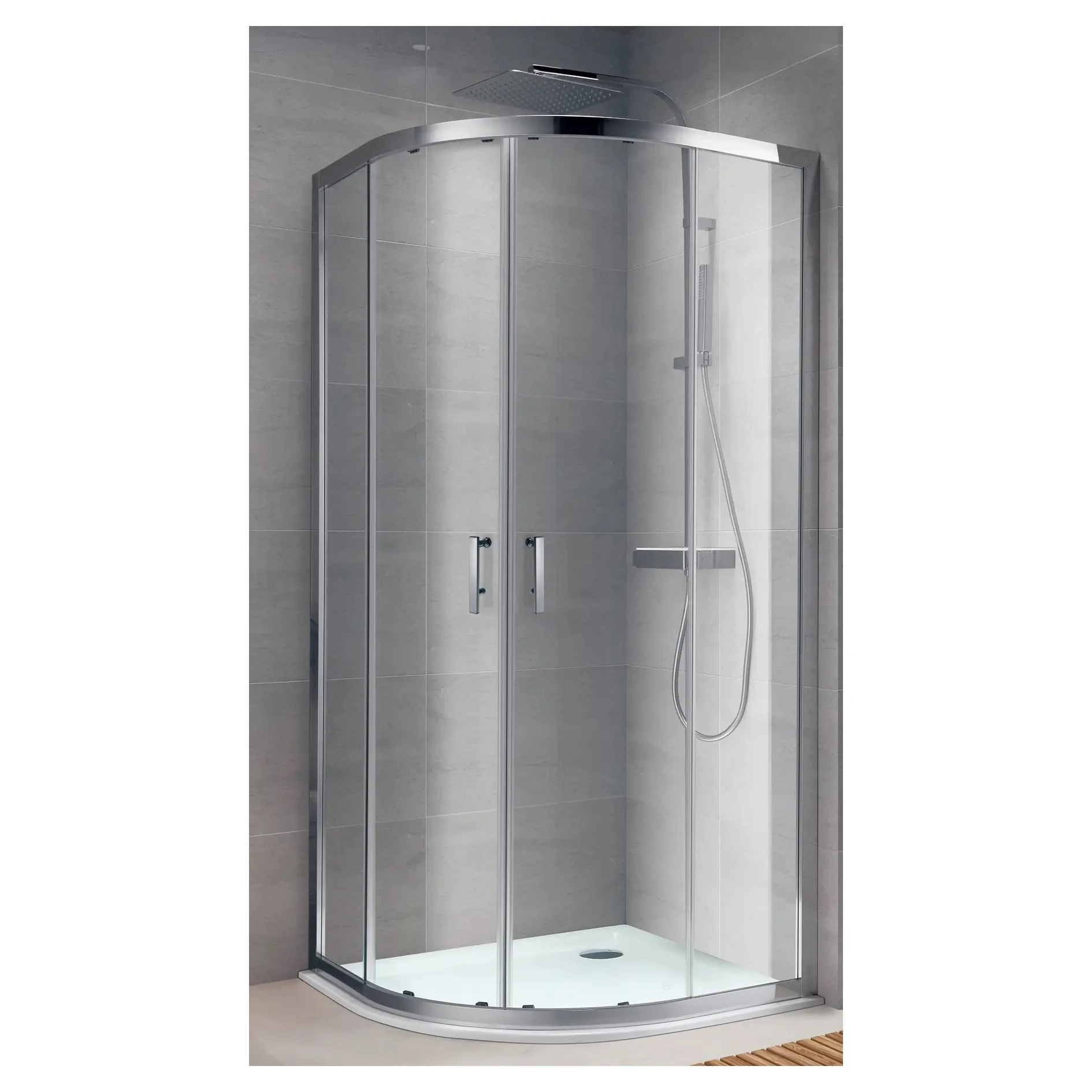 Душова кабіна R90RG ROUND напівкругла Grape KOLLER POOL (R90RG Gr) Чудовий душовий куточок R90RG ROUND 900x900x1850 мм. chrome grape від Koller Pool має конструкцію, яка дозволить ергономічно розмістити кабінку у кутку вашої ванної кімнати. Ця душова кабіна з кутовим входом складається з двох половин, кожна з яких у свою чергу складається з дверей та нерухомої частини. Всі вітражі можна замовити із прозорого або матового скла.