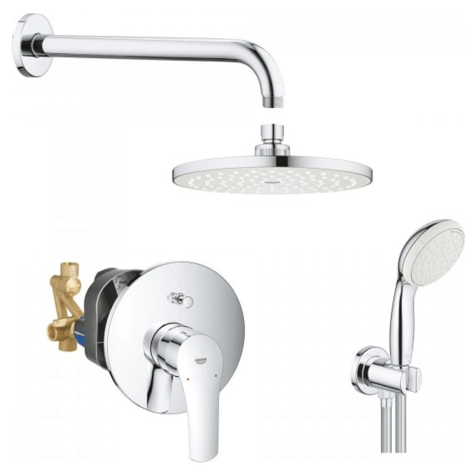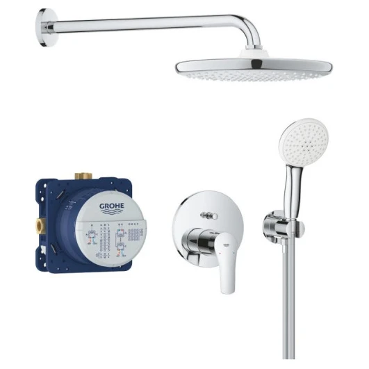 Оснащений передовими технологіями та зроблений у Німеччині, цей набір для душу дає вам все необхідне для розкішного душу в одному комплекті. Він складається з комплекту змішувача прихованого монтажу Eurosmart Cosmopolitan з новим тонким профілем, а також універсального вбудованого елемента GROHE Rapido SmartBox для прихованої установки, верхнього душу Tempesta 210 мм з тримачем для душу 286 мм, ручного душу Tempesta 100 мм з тримачем. Верхній душ оснащений розслаблюючим режимом струменя Rain, а ручний душ пропонує два варіанти: потужний струмінь або м'який режим струменя Rain. Верхній душ GROHE із WaterSaving 9,5 л/м. обмежувачем потоку, заощаджує воду без шкоди для продуктивності. Крім того, силіконове кільце ShockProof захищає ручний душ під час падіння - відмінно підходить для сімей з дітьми. Технологія GROHE DreamSpray забезпечує рівномірний потік з кожної форсунки, в той час як силіконові форсунки SpeedClean можна чистити простим рухом пальця.
