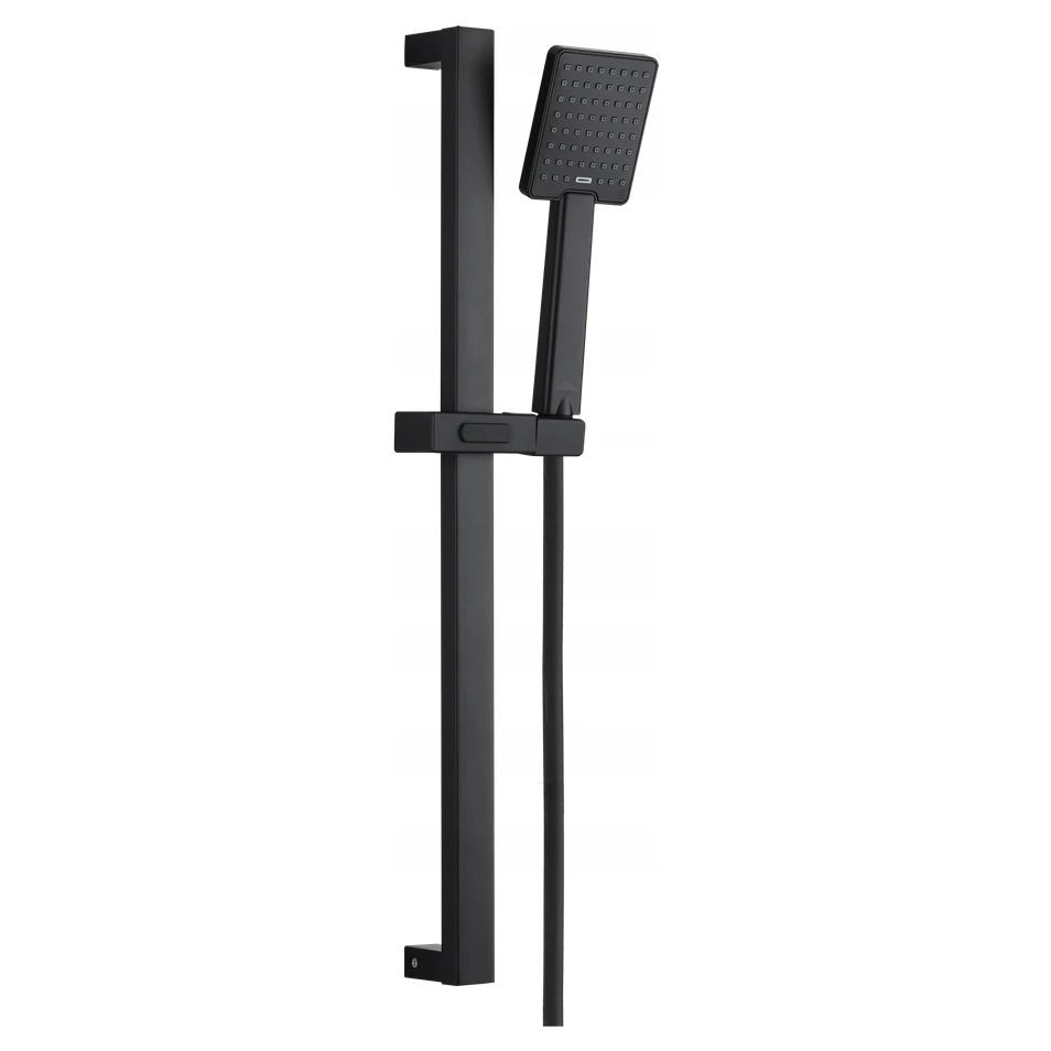 Чорний душовий набір Patras на штанзі. Він створить ідеальне поєднання зі змішувачем для ванни чи душу. Душова стійка, висота: 60 см. Однофункціональний ручний душ (звичайний струмінь), 8,5 х 10 см, із системою проти накипу. Зсувна ручка регулюється за допомогою кнопки - забезпечує зручність використання Регульовані монтажні кронштейни Душовий шланг з нержавіючої сталі з подвійною опліткою, 150 см Колір: чорний