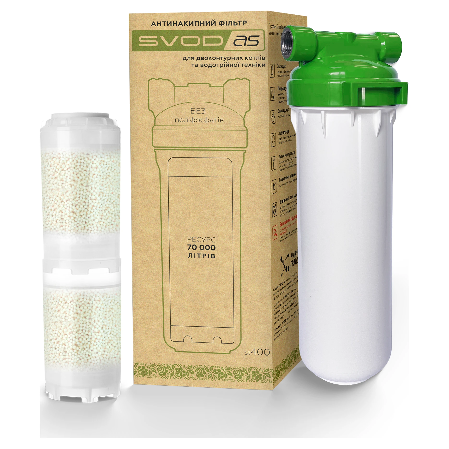 Призначення - захист нагрівального елемента від корозії та накипу (у тому числі раніше утвореного). Крім того, фільтр «СВОД-АС» знижує вміст у воді важких металів, хлору та сірководню; запобігає засміченню вузьких проток у сантехнічних системах. Якщо не давати накипу кристалізуватись (інгібувати процес зростання кристалів), солі жорсткості залишаються в розчиненому стані і не утворюють твердих відкладень. Діюча речовина «СВОД-АС» - це протинакипний реагент харчового класу, "посаджений" усередині аніоніту за розробленою та запатентованою технологією вченими Науково-дослідного та проектного інституту "Водоочисні технології". Робоча температура до 105°C; Вода після фільтру залишається відповідно до ГОСТу «Вода питна»!