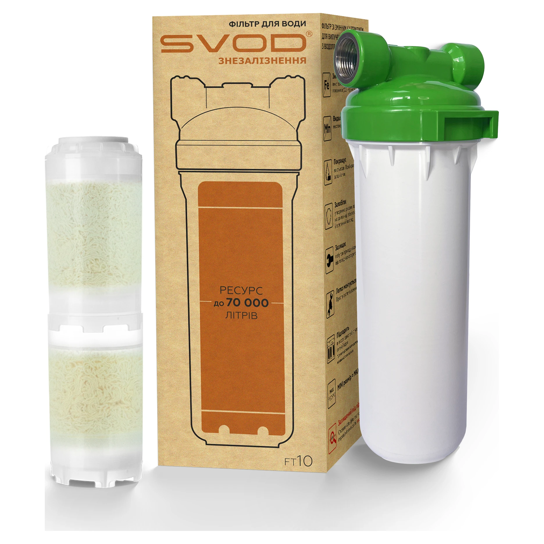 Фільтр кондиціонування води "SVOD" Знезалізнення призначений для видалення заліза з водопровідної води (підключення - латунна різьба). В результаті застосування фільтра знижується вміст двох- і тривалентного заліза до нормативних значень (0,2-0,3 мг/л), видаляється марганець у воді, запобігається утворення іржавих патьоків на сантехніці, прибирається металевий запах і смак з води. Фільтр захищає побутові прилади і сантехніку від передчасного ремонту. При встановлені в систему очищення питної води, рекомендовано розміщувати після фільтра механічного очищення.