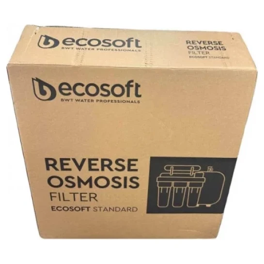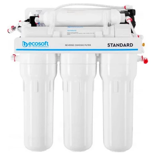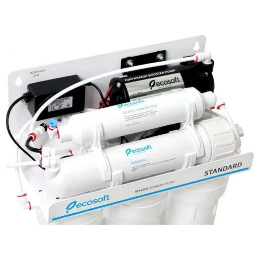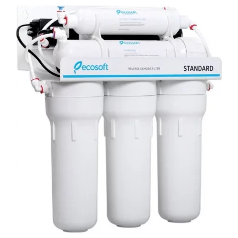 Фільтр зворотного осмосу Ecosoft Standard з помпою призначений для очищення води на молекулярному рівні в будинках та квартирах зі слабким напором в трубопроводі. Продуктивність фільтра — 8 л/год. Фільтр очищає воду від 99,8% забруднень, включно з вірусами та бактеріями. Окрім насоса, в помпі є мікроконтролер та 2 датчики тиску (на вході та виході з мембрани). Насос починає працювати лише, коли тиск не відповідає необхідному діапазону.