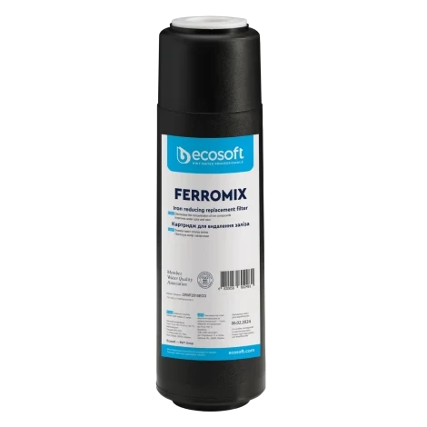 Знезалізнюючий картридж Ecosoft Ferromix 2,5 x 10" (CRVF2510ECO) - використовується для очищення артезіанської води питного і побутового призначення від домішок заліза. Видаляє до 80% заліза. Картридж знижує вміст заліза і його домішок в артезіанській воді, а також знижує концентрацію нафтопродуктів, пестицидів, коригує колір, смак та запах води.