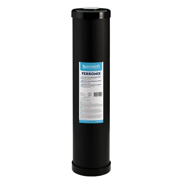 Всередині картриджа для видалення заліза Ecosoft 4,5"х20" знаходиться суміш каталітичного сорбційного матеріалу, високоякісного активованого вугілля та рН-коректора. Картридж знижує вміст заліза та його сполук у водопровідній воді та воді зі свердловини, а також зменшує концентрацію нафтопродуктів, пестицидів, коригує колір та запах води. Корпус картриджа виготовлений з чистого європейського харчового пластика. Картридж підходить для фільтрів інших виробників зі стандартним типорозміром 4,5"х20".