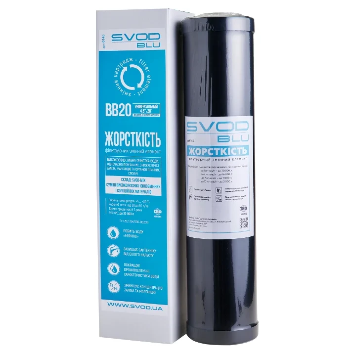 Картридж пом'якшуючий "SVOD BLU" містить засипку з високою здатністю заміни іонів кальцію і магнію на іони натрію. Призначений для пом'якшення холодної води від солей жорсткості. Запобігає утворенню накипу.