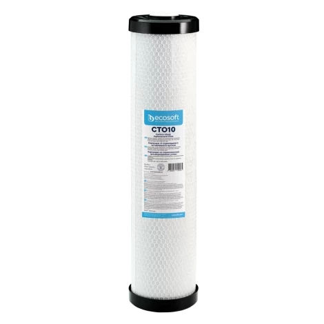 У якості фільтрувального матеріалу використовується спресоване активоване вугілля зі шкарлупи кокосових горіхів. Картридж видаляє з води хлор та хлорорганічні сполуки, зменшує концентрацію важких та кольорових металів, а також фенолу, нафтопродуктів та пестицидів. Коригує колір та запах води. Завдяки своїй спресованій структурі, затримує механічні домішки розміром до 10 мкм. Картридж зі спресованого вугілля Ecosoft 4,5"х20" має чесний ресурс по хлору — 50 000 літрів.