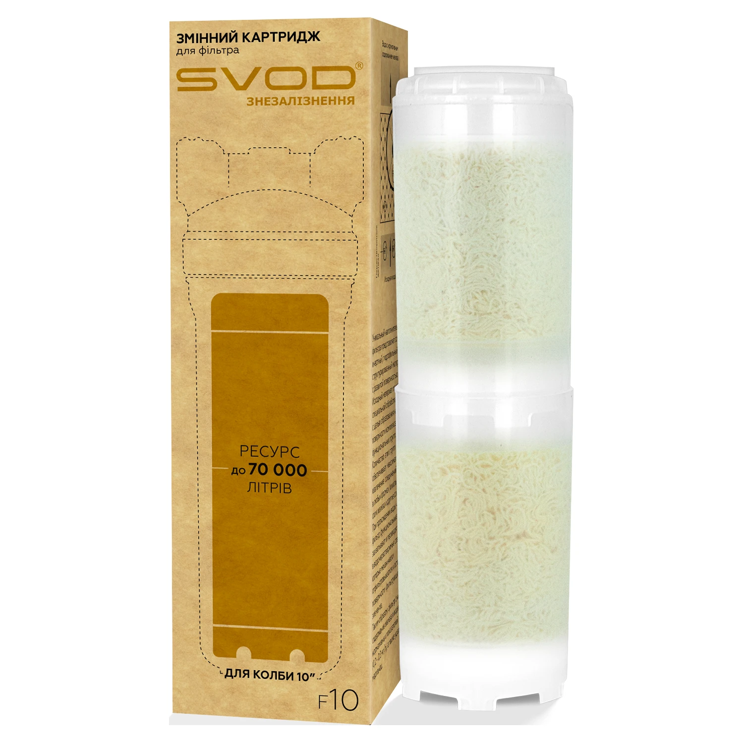 Змінний картридж до фільтру кондиціонування води "SVOD" Знезалізнення призначений для видалення заліза з водопровідної води. В результаті застосування картриджа знижується вміст двох- і тривалентного заліза до норматівніх показань (0,2-0,3 мг/л), віддаляється марганець у воді, запобігається утворення іржавих патьоків на сантехніці, прибирається металевий запах і смак з води. Картридж «СВОД» Знезалізнення захищає побутові прилади і сантехніку від передчасного ремонту.