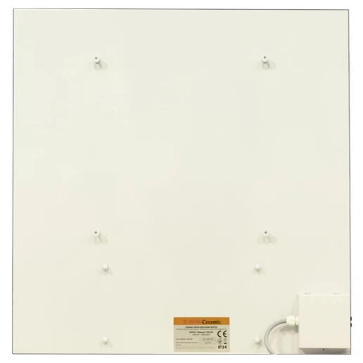 Економний обігрівач Теплокерамік ТСМ RA 500 – удосконалена класична модель з вбудованим регулятором температури.Розміри керамопанелі збігаються з розмірами Теплокерамік ТСМ 400, але ТСМ РА 500 – більш потужний обігрівач (500 Вт) з функціями регулювання температури.Особливості технології Теплокерамік з вбудованим регулятором.Інфрачервоний керамічний обігрівач Теплокерамік ТСМ RA 500 має два датчика температури:• внутрішній (прихований), який підведений до лицьової поверхні панелі і дозволяє встановлювати температуру нагрівання плити від 40 С до 95 С;• зовнішній (довжина до 3 см, практично непомітний), який знаходиться внизу корпуса обігрівача і дозволяє задавати температуру нагріву повітря в приміщенні від 5 С до 35 С. Екран терморегулятора знаходиться збоку електричного настінного нагрівача Теплокерамік, що робить його непомітним і не псує дизайну керамічної панелі. Дві кнопки дозволяють задати потрібну температуру інфрачервоної панелі. Регулятор температури підходить для дитячих кімнат, садків і шкіл, де є н
