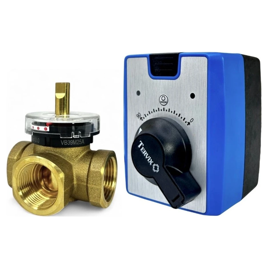 Електричний привід AMV Tervix Pro Line призначений для роботи з 3-ходовими поворотно-змішувальними клапанами, такими як Tervix RMV. Керувати комплектом можна як автоматично за допомогою Euroster 11M, Euroster 12M, так і вручну за допомогою ручки, для цього потрібно натиснути і утримувати перемикач. Основна функція електропривода - змішування двох потоків через змішувальний клапан для отримання заданої температури на виході. В режимі змішування - при повороті заслінки в одну сторону буде поступово відкриватися прохід для гарячого теплоносія і в рівній мірі закриватися прохід для холодого.Це підвищує температуру змішаного робочого теплоносія при майже постійній швидкості потоку, відповідно при повороті заслінки в іншу сторону, прохід для гарячого теплоносія буде закриватися, а для холодого - відкриватися. Таким чином підтримується постійна задана температура теплоносія на виході з клапану.