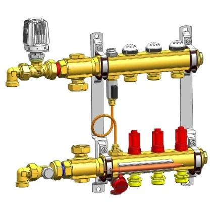 Колектор для теплої підлоги HERZ COMPACTFLOOR Light SK, виконання без насосу (3 відводи) надійний пристрій для встановлення та використання в підлоговому опалюванні. Під'єднання до системи опалення підлог відбувається ліворуч під кутом 90 градусів. Цей модуль обладнаний регулювальним клапаном RL-5 та дає змогу під'єднати три контури. Працює в мережі з максимальною робочою температурою 110 °C (у первинному контурі)). Усі елементи цього модуля виготовляються з високоякісних матеріалів, що мають високі показники зносостійкості та міцності. Складові елементи виробу: розподілювач прямого потоку з витратомірами, розподілювач зворотного потоку з термостатичними клапанами, краном для спуску повітря, краном для зливу з штуцерами для приєднання шланга, регулюючий клапан RL-5 c можливістю гідравлічного настроювання і зливу, зоний клапан TS-90, термостатична головка з накладним датчиком. Регулювання перепаду тиску за допомогою байпасної трубки. Колекторні балки зроблені з латуні.