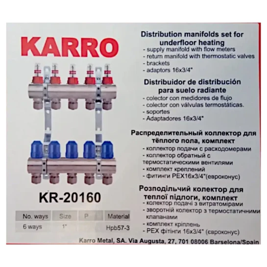 Колектор термостатичний з витратомірами + євроконуси KARRO 1"х10 це зручне рішення для сучасних систем теплої підлоги. Виріб видрізняється високою якістю та давготривалим терміном експлуатації. Колектор дозволяє підключити десять теплових контурів до одного джерела теплопостачання. Матеріал виготовлення колекторних балок — латунь. За допомогою витратомірів регулюється інтенсивність подачі теплоносія в труби, що дає можливість вирівняти гідравлічний тиск на вході, тому всі контури віддають тепло з однаковою інтенсивністю.