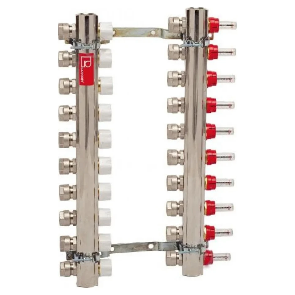 Колектор Luxor з витратомірами та термоклапанами призначений для опалювальних систем «тепла підлога». Колекторна група дозволяє розподіляти первинний теплоносій при високій температурі у вторинному контурі із заданою температурою. Перевагою використання колектора є компактність, а можливість регулювання дозволяє уникнути перепадів тиску між споживачами. Всі колектори мають єдиний європейський стандарт з'єднання: евроконус. Колекторні балки виготовлені з латуні високої якості. Максимальна температура теплоносія 120 °С (у первинному контурі), тиск до 10 бар. Пристрій має 3 виходи для підключення контурів опалення. Міжосьова відстань становить 50 мм.