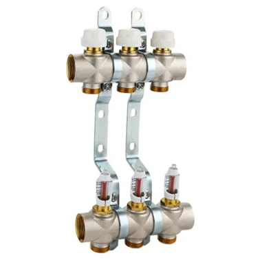 Колектор MAREK 1" х 3 виходи з витратомірами та євроконусами виготовлений з нержавіючої сталі з можливістю регулювання між осьової відстані між подавальним і зворотним колектором, що дозволяє максимально зручно здійснювати монтаж обладнання в розподільчій шафі.На колекторі, що подає, встановлені настроювальні клапани з витратомірами, зворотний колектор оснащений термостатичними клапанами (ручні, можна за потреби обладнати сервоприводами).