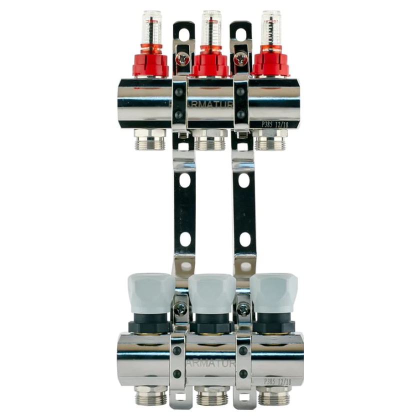 Колекторна група PROFACTOR з витратомірами та термостатичними клапанами 1" х 3/4"M (3) необхідна для створення системи автономної циркуляції у системах теплої підлоги або радіаторного опалення. Такі колекторні групи (разом з насосно-змішувальними вузлами) використовують для розподілу потоку середовища, яке транспортується по споживачам, що дозволяє здійснювати регулювання та контроль потоку теплоносія окремо у кожному циркуляційному контурі.