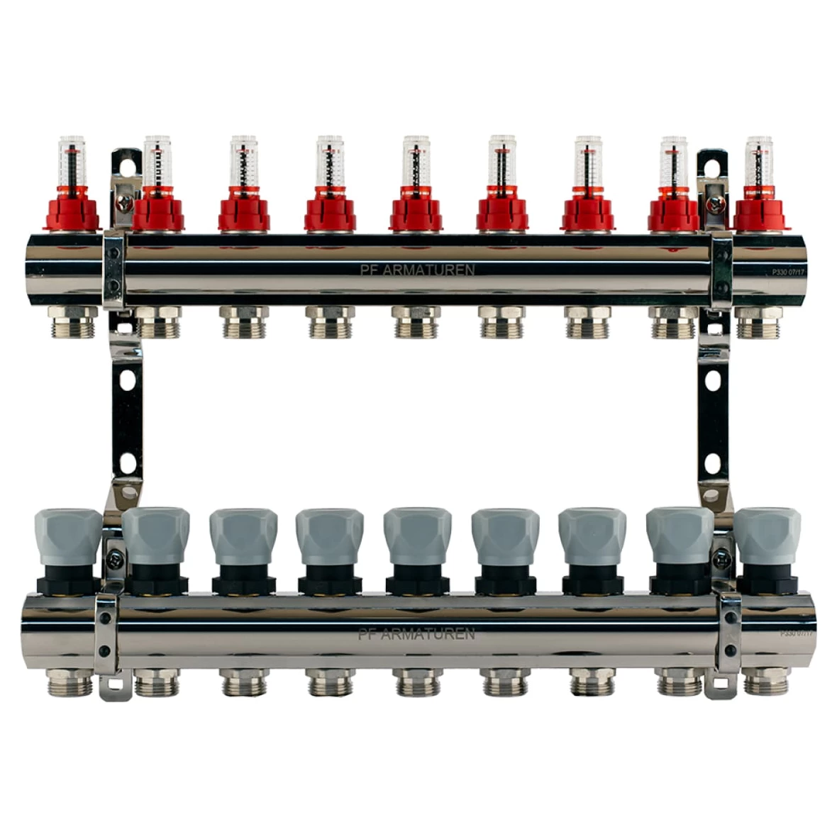Колекторна група PROFACTOR з витратомірами та термостатичними клапанами 1" х 3/4"M (9)необхідна для створення ліній автономної циркуляції у системах теплої підлоги або радіаторного опалення. Такі колекторні групи (разом з насосно-змішувальними вузлами) використовують для розподілу потоку середовища, яке транспортується по споживачам, що дозволяє здійснювати регулювання та контроль потоку теплоносія окремо у кожному циркуляційному контурі. Матеріал виготовлення колекторних балок: латунь нікельована CW617N (DIN EN 12165).