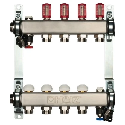 Колектор HERZ (1") (9 відводів) з витратоміромірами та термостатичними кранами вироблений з нержавіючої сталі. Це надійний австрійський виріб, що складається з балок гребінки прямого потоку з витратомірами і зворотнього з термостатичними буксами, кранів для спуску повітря, кранів для зливу води з штуцерами для приєднання шлангів, кінцевих заглушок і кріплень. Придбання цього пристрою буде надійним рішенням для облаштування теплої підлоги у квартирі чи будинку. Прилад міцний, має добру корозійну стійкість. Колектор може бути встановлений безпосередньо на стіні або в розподільчій шафі за допомогою кріплень. Важливо не забувати, що рекомендується не робити петлю більше ніж 70 метрів труби на один контур теплої підлоги.