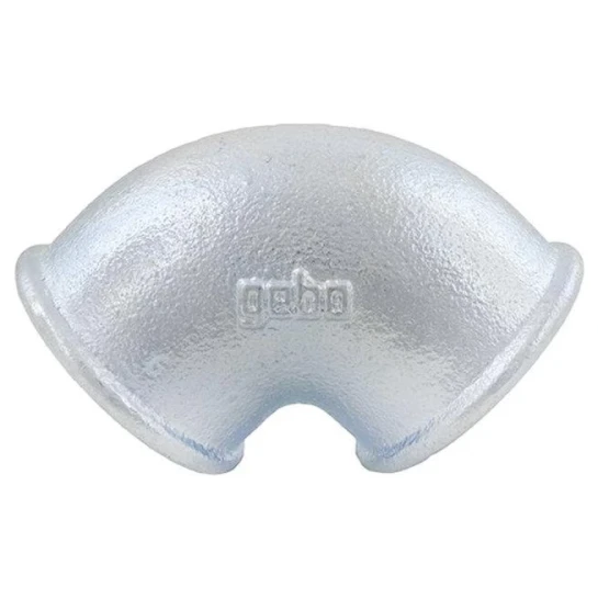 Коліно Gebo виготовлене із гнучкого чавуну з подвійним гальванічним оцинкуванням. Служить для з'єднання під прямим кутом труб з однаковим діаметром. Після виконання різьблення, всі фітинги Gebo піддаються додатковому оцинковуванню, таким чином різьблення отримує додатковий захист від корозії. Фітинги з гнучкого чавуну ідеально підходять для рідин, повітря, газу, води.