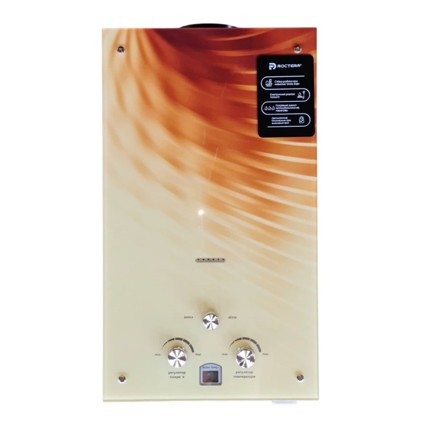 Газова колонка Rocterm ВПГ-10AE - забезпечена необхідним набором систем безпеки та контролю. Оснащена потужним мідним теплообмінником вагою 2,2 кг, який дозволяє досягти не тільки високої продуктивності, але й суттєво продовжити термін служби колонки.