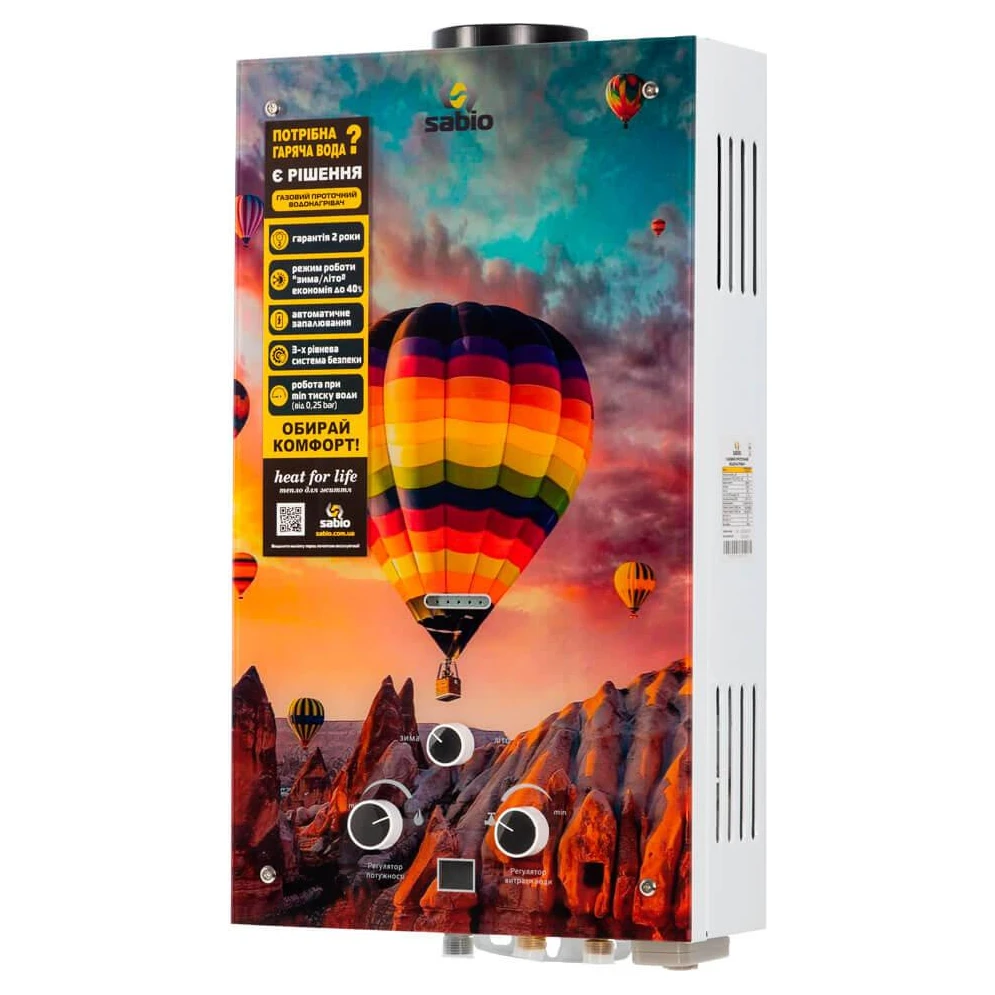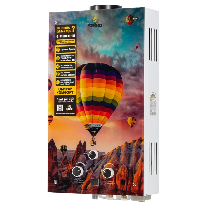 Газова колонка Sabio 10л GP-aerostat Газовий водонагрівач Sabio призначений для приготування гарячої води в побутових умовах. Увімкнення водонагрівача відбувається автоматично під час відкриття водопровідного крана.Технічне оснащення: електронне розпалювання від батарей; автоматична підтримка температури та витрати води при зміні тиску води у водопроводі; термоелемент для контролю полум'я; захист від перегріву; пристрій контролю тяги з автоматичним вимкненням колонки; атмосферний газовий пальник з нержавіючої сталі; мідний теплообмінник вагою 2,5 кг.