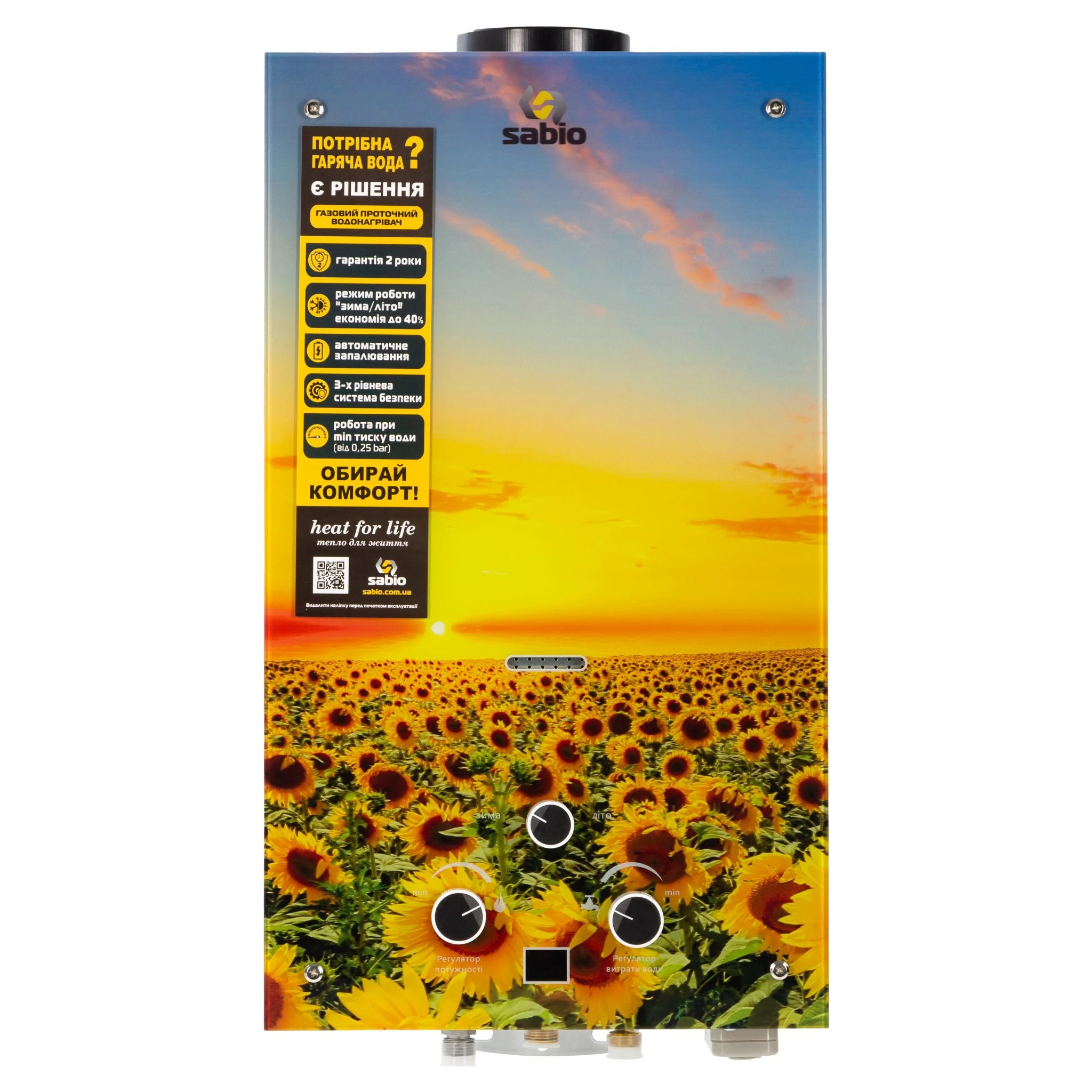 Газова колонка Sabio 10л GP-sunflower Газовий водонагрівач Sabio призначений для приготування гарячої води в побутових умовах. Увімкнення водонагрівача відбувається автоматично під час відкриття водопровідного крана.Технічне оснащення: електронне розпалювання від батарей; автоматична підтримка температури та витрати води при зміні тиску води у водопроводі; термоелемент для контролю полум'я; захист від перегріву; пристрій контролю тяги з автоматичним вимкненням колонки; атмосферний газовий пальник з нержавіючої сталі; мідний теплообмінник вагою 2,5 кг.