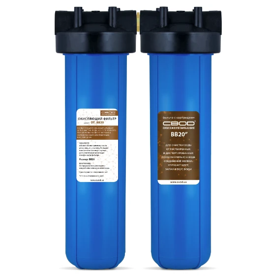 Для води з вмістом заліза до 2 мг/л рекомендуємо встановити комплект фільтрів "SVOD" Знезалізнення 2_OFT_BB20. Для збільшення ступеня затримування по двовалентного заліза необхідно встановити передфільтр "SVOD" - окислюючий.