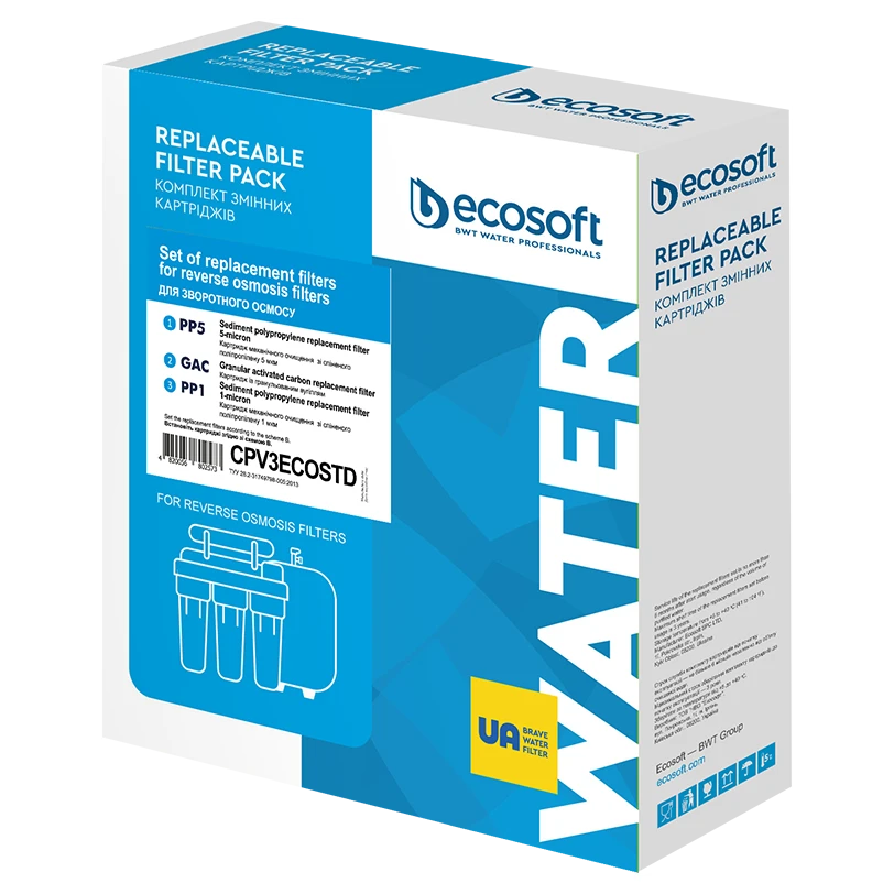 В комплект входять три картриджі Ecosoft, які необхідні для попереднього очищення води перед мембранним елементом у фільтрі зворотного осмосу.