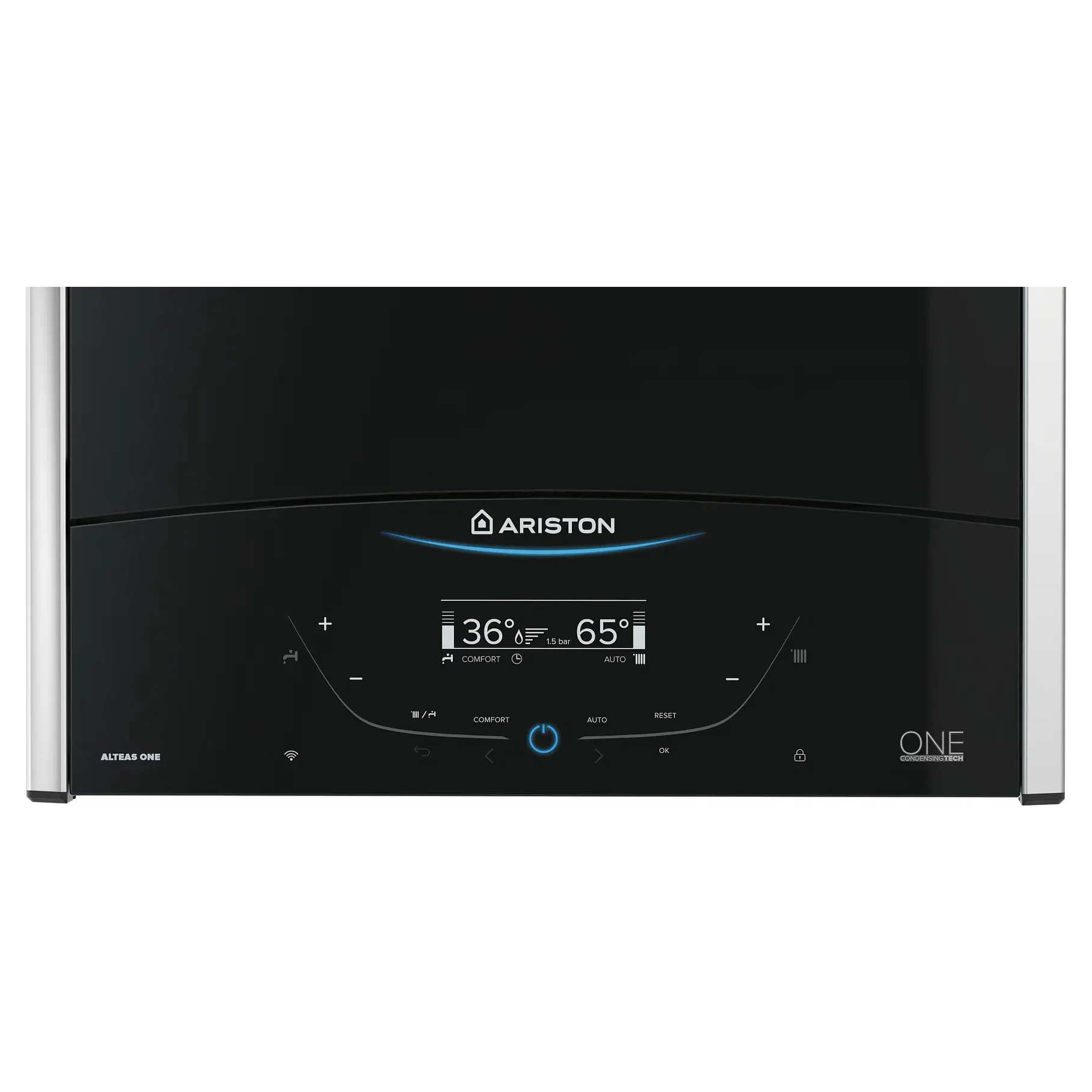 Котел газовий ARISTON ALTEAS ONE NET 24 кВт конденсаційний (3301058) Габарити (ВхШхГ): 770x400x315 мм Вага: 32.7 кг Преміальний дизайн, повністю модульований насос, функція контролю горіння, теплообмінник XtraTech з нержавіючої сталі, вбудована плата Wi-Fi, в комплекті датчик кімнатної температури CUBE і датчик вуличної температури. Розміщення: настінний, Конденсаційний Тип: двоконтурний (опалення та нагрів) Площа опалення: 195 м² Технічні х-ки: Корисна потужність: 24.4 кВт Мін. потужність: 2.5 кВт Живлення: 220 В Споживана потужність: 80 Вт Мін. t теплоносія: +35 °С Макс. t теплоносія : +82 °С Макс. тиск у контурі опалення: 3 бар Макс. тиск у контурі ГВП: 7 бар Споживчі х-ки: Мін. t гарячої води 36 °С Макс. t гарячої води 60 °С Продуктивність (Δt =25 °C) 12.8 л/хв Продуктивність (Δt ~30 °C) 11 л/хв Wi-Fi Літній режим роботи Функція «гарячий старт» Циркуляційний насос Шина управління Bus BridgeNet Програматор Характеристики котла ККД 107.4 % Камера згоряння закрита (турбований)