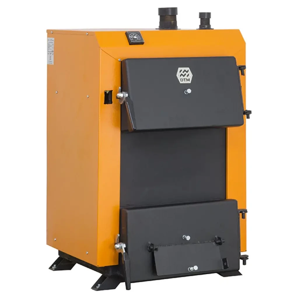 Твердопаливний котел DTM 20 кВт серії Standart — це сталевий твердопаливний котел з поличним теплообмінником із наповненими водою колосниками. Котел працює на будь-якому типі твердого палива (вугілля, дрова, брикет, торф і тощо) і завдяки своїй конструкції має високу ефективність (ККД 85%).Максимальна температура теплоносія: +95 °С. Літраж (води в котлі) — 65 л. Товщина металу теплообмінника: 4 мм. Завантажувальне вікно: 202/358 мм. Мінімально допустима висота димоходу складає 5 м.