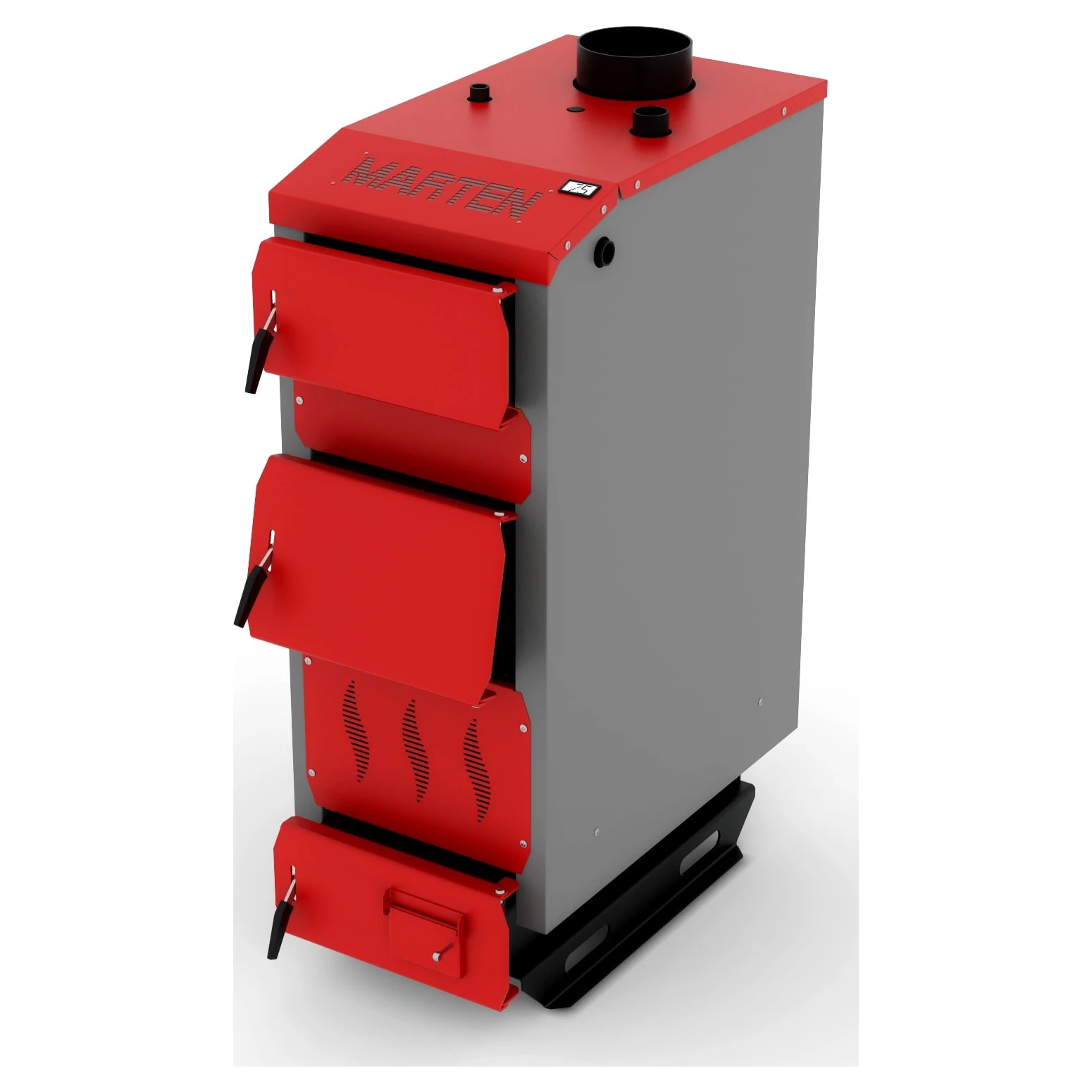Твердопаливний котел Marten Praktik MP-30 при компактних габаритах має велику камеру завантаження і збільшений теплообмінник, що дозволяє йому опалювати приміщення площею до 300 кв.м. Патрубки підключення 1 1/2". Об'єм топки: 118,00 л. Цей котел має інноваційну будову, яка дозволяє забезпечити максимально ефективний обмін тепла та незалежність від зовнішніх джерел енергії. Якісне порошкове покриття, автоматизоване зварювання швів підвищують розрахунковий термін експлуатації обладнання обладнання.
