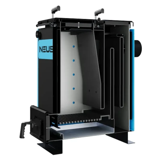 NEUS MINE XL 12 кВт — це надійний та ефективний котел тривалого горіння, спеціально розроблений для опалення невеликих приватних будинків та комерційних приміщень площею до 120 кв.м. Головною особливістю серії MINE XL є суттєво збільшена глибина топки, що дозволяє завантажувати довші дрова та значно подовжує інтервали між завантаженнями палива.