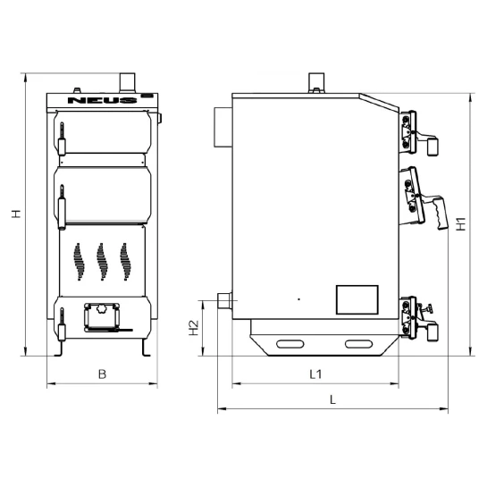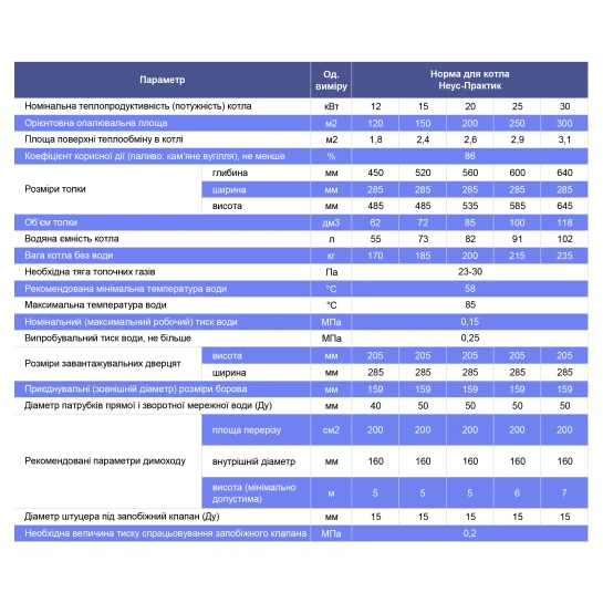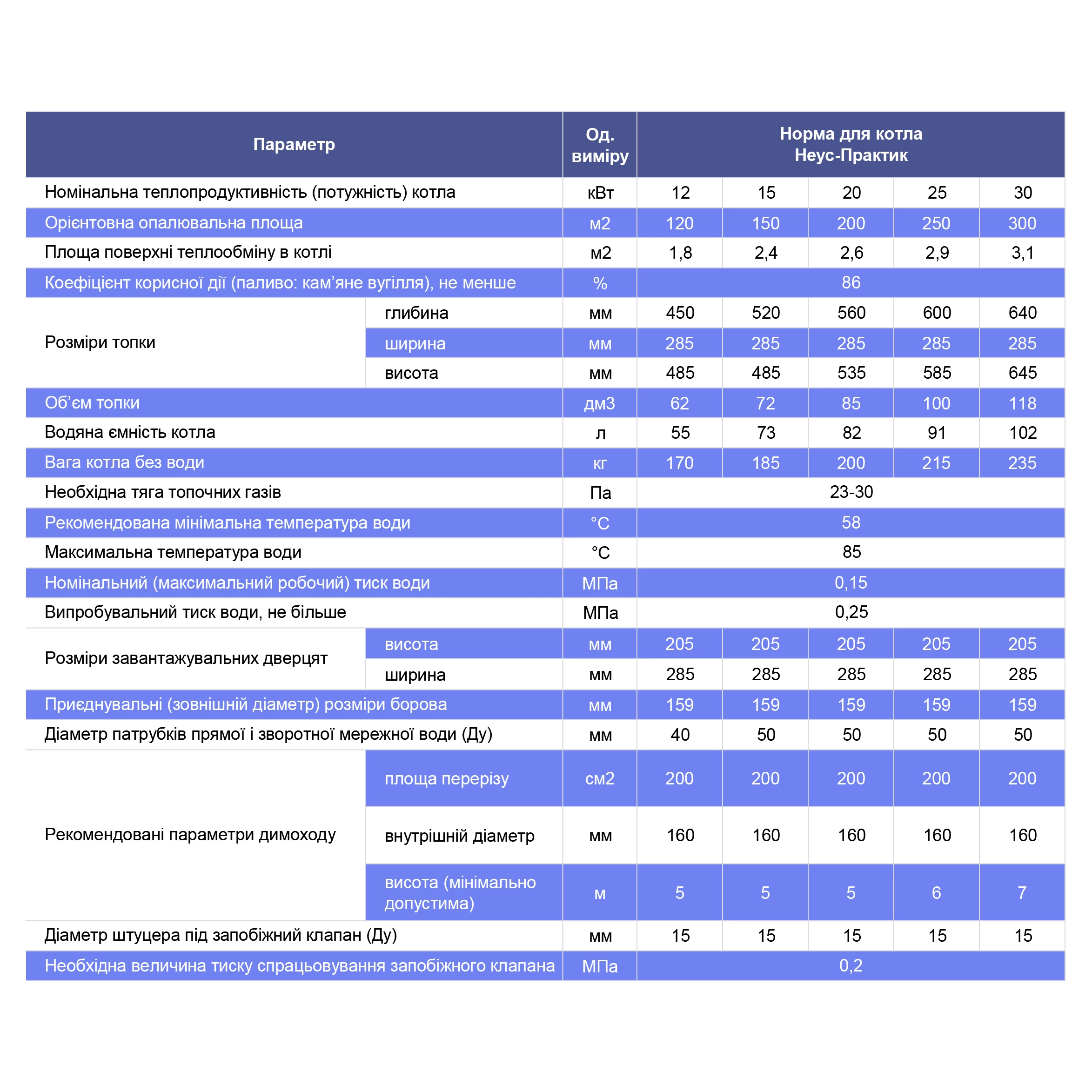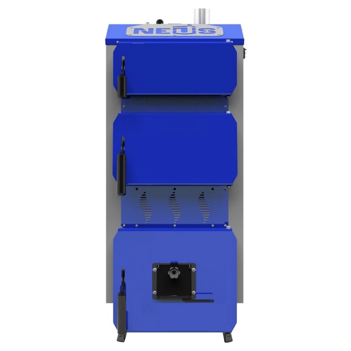 Котел твердопаливний NEUS PRAKTIK NEW 15 кВт. Характеристики: ККД: 86 % Сторона завантаження палива-Фронтальна Діаметр димоходу: 160 мм Робота в автономному режимі від одного завантаження: 6-12 годин Тип котла: Тривалого горіння Об'єм води в котлі: 73 л Робочий тиск води: 1.5 кПа Вид застосовуваного палива: Вугілля, Вугільний пил, Дрова, Пелети, Тирса, тріска, стружка, Торфобрикети/торф Вага: 185 кг Габарити (ВхШхГ): 45 х 115 х 95 см Габарити в упаковці (ВхШхГ): 50 х 120 х 100 см