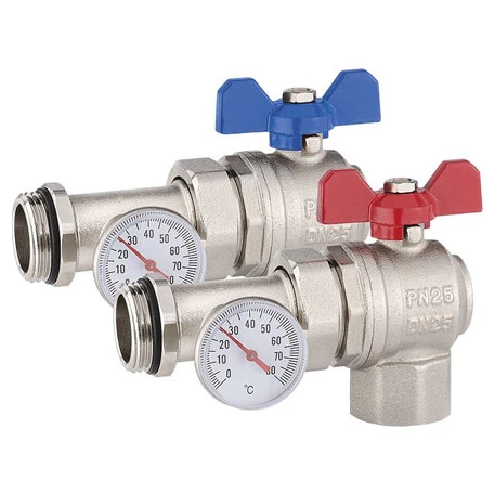 Кран кульовий кутовий з напівзгоном та термоментром для колектора PROFACTOR 1" (PF MB 849.25) застосовують як запірну арматуру на трубопроводах систем питного, господарсько-побутового та промислового призначення, гарячого водопостачання, опалення тощо, а також на технологічних трубопроводах, що транспортують рідини неагресивні до матеріалів виготовлення крана. Кран із напівзгоном дозволяє створювати легкороз'ємні вузли трубопровідних сантехнічних систем, а кільцеве ущільнення забезпечує герметичність приєднання. Пристрій обладнаний ручкою «метелик». Матеріал виготовлення: латунь. Шкала термометра: від 0 до 80 °C.