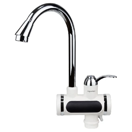 Кран-водонагрівач проточний JZ 3.0кВт 0.4-5бар для кухні гусак вухо на гайці AQUATICA (JZ-6B141W) Торгова марка AQUATICA Гарантія:12 місяців Технічні дані: Тип: Кран-водонагрівач Установка здійснюється врізним способом з кріпленням на гайці, система підігріву підключається до електромережі 220 В. Вага: 0.96 кг Довжина кабелю: 1,2 м Дисплей Цифровий, зелений Потік гарячої води 2–2.5 л/хв Номінальна потужність: 3 кВт Вилив J-образний, поворотний 360° Температура гарячої води 30–60° С Нагріваючий елемент ТЕН Струм 13.6 А Матеріал змішувача Термостійкий ABS-пластик Тип монтажу: На раковину/мийку Тільки для чистої води БЕЗ домішок, що містять абразиви (піску, глини, вапна тощо). Проточний водонагрівач підійде для використання на домашній кухні, на дачі або в кафе, де немає можливості поставити газову колонку або бойлер. Даний проточник складається з термостійкого корпусу з цифровим дисплеєм і нагрівальними елементами. Регулювати температуру і натиск струменя допомагає ручка типу важеля. Гусак J