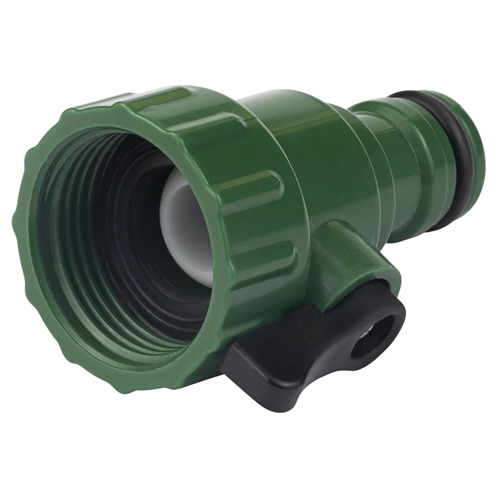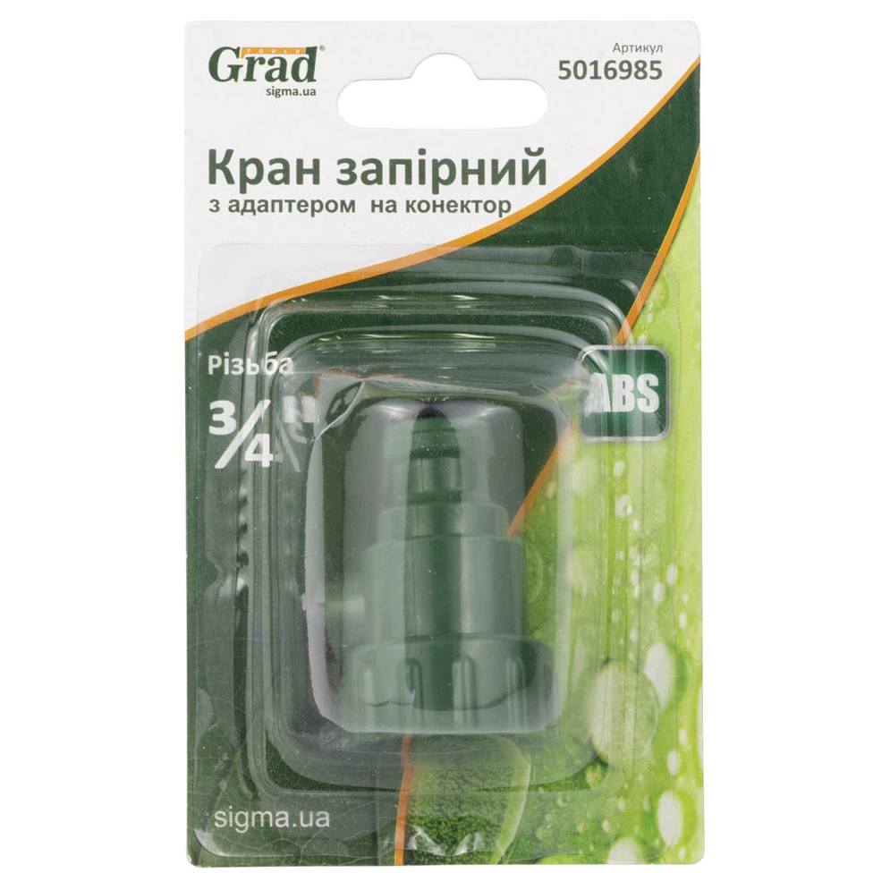 Кран запірний в/р ¾" з адаптером на конектор ½" (ABS) GRAD (5016985) призначений для регулювання подачі і напору води, яка подається в систему зрошення, або її повного відключення. Регулювання напору води і її відключення відбувається за допомогою спеціального вентиля, що знаходиться на клапані. Зручна конструкція гарантує надійне з'єднання і виключення вилітання. Має внутрішню різьбу 3/4" для приєднання до крану і вихід діаметром 1/2" для приєднання шлангу.