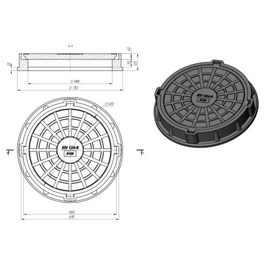 Люк каналізаційний полімерпіщаний Середній (В125) 12,5т 740мм чорний