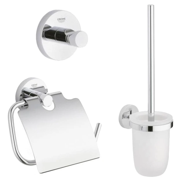 Набір аксесуарів 3 в1 Essentials GROHE (40407001) Представлений тут комплект для ванної 40407001 серії Essentials складається з настінного гачка для халата 40364001, підвісного тримача для туалетного паперу на один рулон із кришкою 40367001 й підвісної колби з матового скла із йоржиком 40374001. Набір зроблений у зносостійкому хромованому покритті з використанням технології GROHE StarLight, і стане ідеальним вибором для вашої ванної кімнати. Всі деталі комплекту зроблені в дизайні, який не застаріє згодом, а також підкорить вас якістю виконання. Доповніть свою ванну набором відразу з трьох аксесуарів!