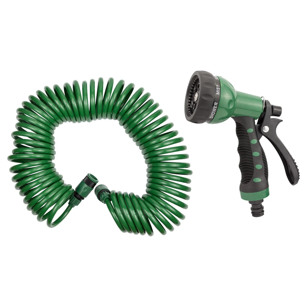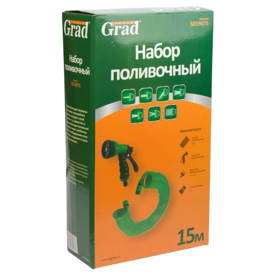 Набір поливальний: шланг спіральний 15м + пістолет-розпилювач 7-ми режимний GRAD (5019075) призначений для спрямованого поливу присадибних ділянок, городів, клумб, газонів і т.д. Сумісний з усіма елементами поливальної системи і може комбінуватися з необхідними пристроями і насадками за бажанням користувача.