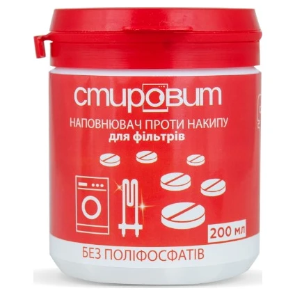 Ефективна, екологічно безпечна альтернатива поліфосфатній солі! Збалансована рецептура важкорозчинних таблеток дозволяє домогтися припинення процесів корозії та накипівтворення на ТЕНі та в барабані пральної машини. Призначений для заміни у «фільтрі Стировит 100мл» Об'єм наповнювача 200мл. Вистачає на 2 заміни