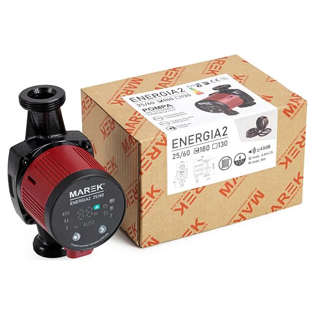 Високоефективний циркуляційний насос МАРЕК ENERGIA 25/60/130 з авточастотним регулюванням відповідає класу енергозбереження «А» відповідно до європейських стандартів. Циркуляційні насоси МAREK серії ENERGIA це насоси з мокрим ротором і різьбовим з'єднаннями, обладнані електромотором на постійних магнітах. Управління засноване на частотному перетворювачі. Ця серія насосів призначена для забезпечення циркуляції рідини в системах опалення і оптимальна для встановлення в системах тепла підлога, однотрубних та двотрубних системах опалення, ГВП, системах кондиціонування повітря.