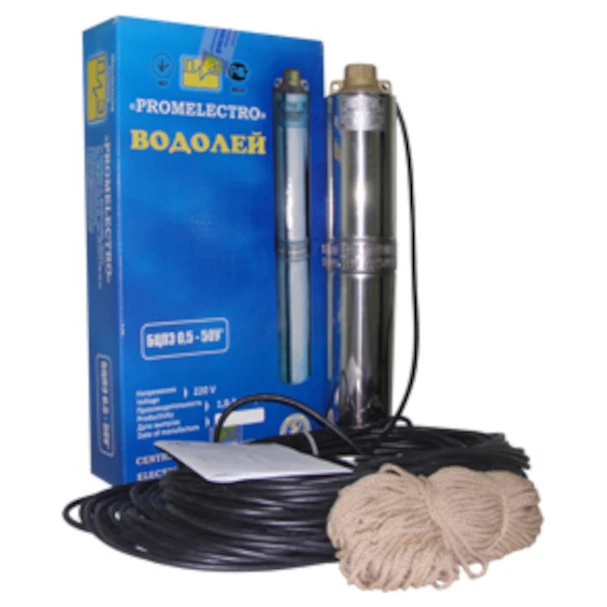 Водолій насос глибинний БЦПЕ 0,5 - 50 У призначений для подачі води в побутових умовах із свердловин з внутрішнім діаметром від 110 мм і більше (діаметр насоса разом з електрокабелем — 105 мм) і може використовуватися також для подачі води з шахтних колодязів (зручний тому що має бічний забір води), резервуарів та відкритих водойм для поливу садів та городів.