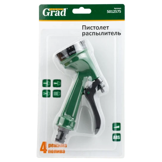 Пістолет-розпилювач 4-х режимний АВС GRAD (5012575) призначений для поливу різних рослин. Дозволяє плавно регулювати потік води, що скорочує її витрата. Має чотири режими поливу, придатних для різних умов. З'єднується зі шлангом за допомогою швидкоз'ємного коннектора.
