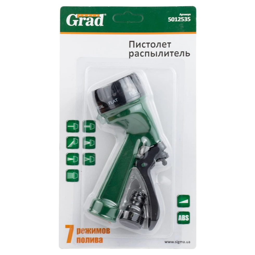 Пістолет-розпилювач 7-ми режимний АВС GRAD (5012535) призначений для поливу різних рослин. Дозволяє плавно регулювати потік води, що скорочує її витрати. Має сім режимів поливу, придатних для різних умов. З'єднується зі шлангом за допомогою швидкоз'ємного коннектора.