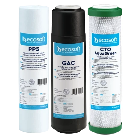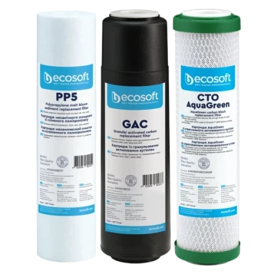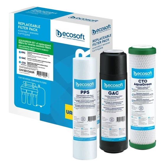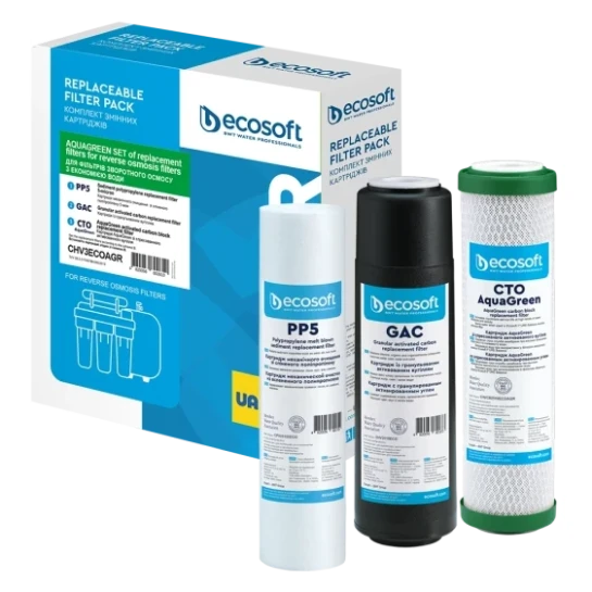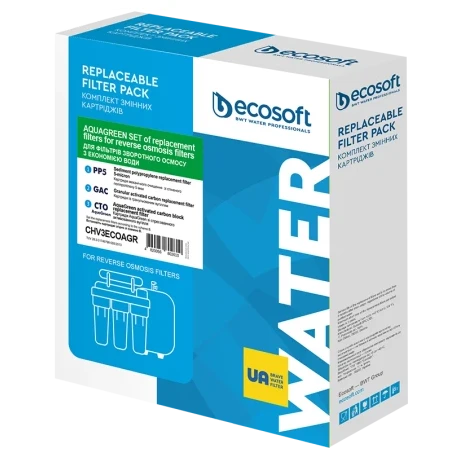 Покращений комплект картриджів Ecosoft 1-2-3 (CHV3ECOAGR) для фільтрів зворотного осмосу з функцією економії води - комплект складається з трьох картриджів Ecosoft, необхідних для підготовки води перед мембранним елементом у домашньому фільтрі з технологією зворотного осмосу. У комплект входять два вугільні картриджі, тому він підходить для води з високим вмістом хлору.