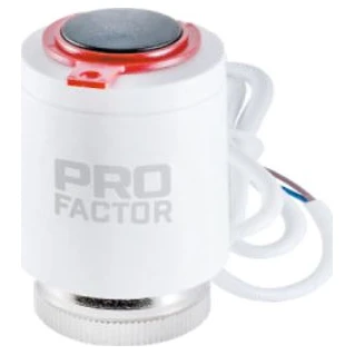 Привід PROFACTOR термоелектричний діагностуючий потужність: 2,5 Вт призначений для двопозиційного регулювання в системах опалення та холодопостачання. Тип приводу: NC (нормально закритий). Найчастіше використовуються для зонального регулювання в системах радіаторного та підлогового опалення. Термоелектричні приводи PROFACTOR можуть встановлюватися на запірно-регулювальні клапани колекторних груп, термостатичні клапани радіаторів, клапани для фанкойлів та зональні клапани. Наводяться в дію від кімнатного термостата або спеціалізованого контролера. Повний хід штока: 4 мм. Час повного відкриття/закриття: ~3-5 хв.Зусилля на штоку: 90–125 Н. Робоча напруга: AC 230V. Довжина кабелю: 0,6 м. Ступінь захисту IP44