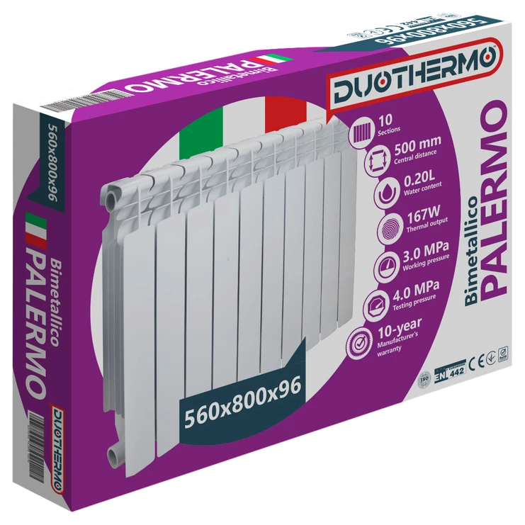 Радіатор біметалевий PALERMO 500/96 призначений для установки в приміщеннях, підключених до автономного та центрального опалення. Біметалеві секційні радіатори опалення PALERMO - це радіатори, що складаються з двох видів металу (переважно зі сталі та алюмінію). Циркуляція теплоносія здійснюється по сталевих трубок, укладеними в алюмінієвий кожух. Поєднання цих металів і забезпечує біметалічним радіаторів PALERMO поліпшені експлуатаційні характеристики, а, отже, і перше місце по затребуваності.