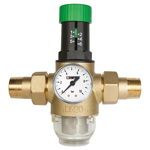 Редуктор тиску HERZ 1/2" для холодної води (арт. 1268211) — це надійний пристрій, який захищає систему водопостачання від надлишкового тиску (знижує тиск на вході до робочого рівня). Монтаж редуктора можливий на горизонтальній (фільтром донизу) і вертикальній ділянках трубопроводу. Виріб обладнаний фільтром. Фільтрувальна частина — це знімнна колба з картриджем з нержавіючої сітки, з розміром комірки 0,3 мм. Корпус редуктора виготовлено з якісної латуні, колба фільтра — з прозорого пластику. У комплект входять накидні гайки 1/2" та манометр.