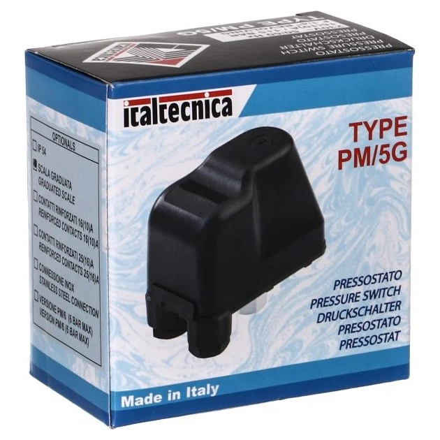 Реле тиску ITALTECNICA PM/5G14 SG — це ключовий автоматичний пристрій, призначений для керування електричними насосами або насосними станціями у системах водопостачання. Воно відповідає за підтримку заданого діапазону тиску шляхом автоматичного вмикання та вимикання насоса.